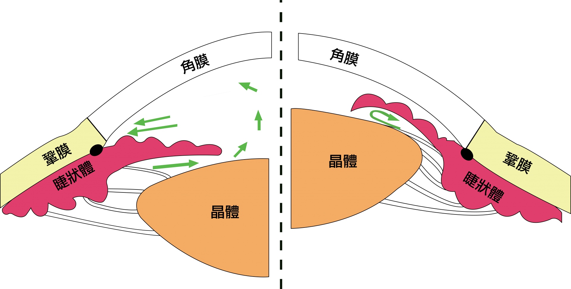 右:房水正常經瞳孔流至房角;左:瞳孔阻滯,房水無法從瞳孔流至房角